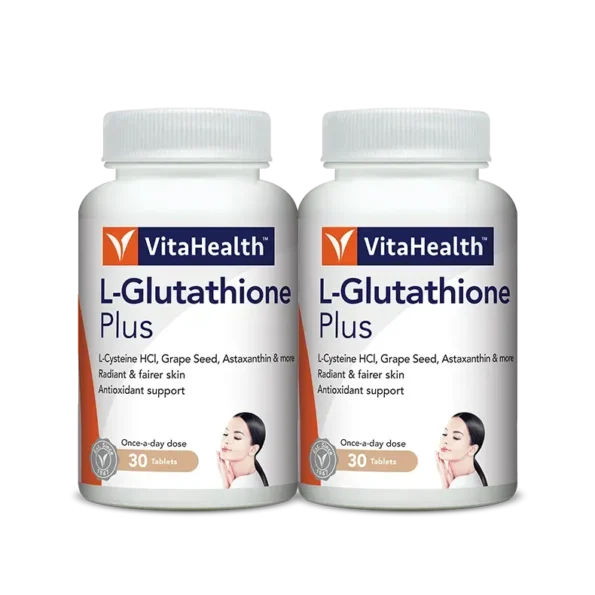 VitaHealth L-Glutathione Plus is a skin-whitening formula, containing L-glutathione which works synergistically with 6 other skin-nourishing nutrients to keep skin healthy and glow from within naturally.
