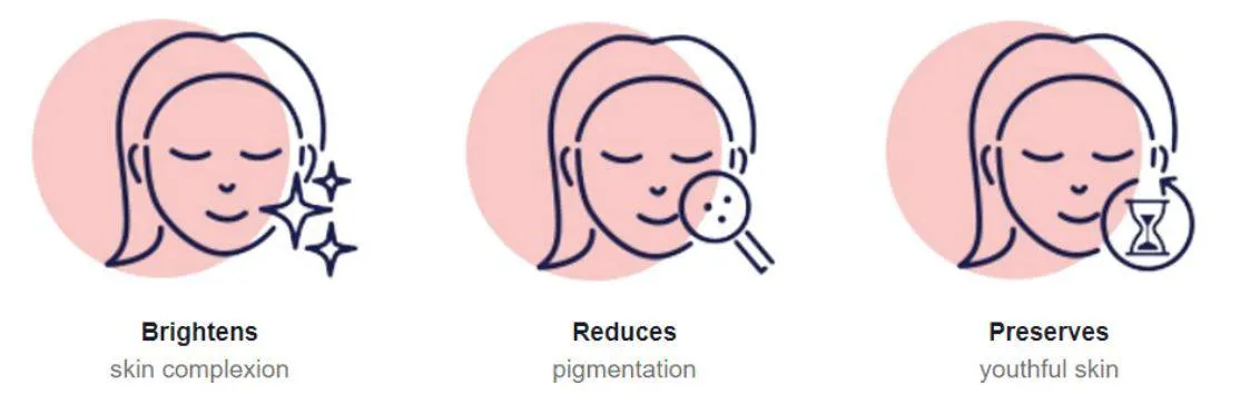 Regarded as the body’s master antioxidant, L-glutathione activates your skin’s internal defence against UV rays through its anti-melanogenic and anti-oxidant properties.