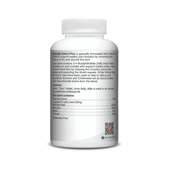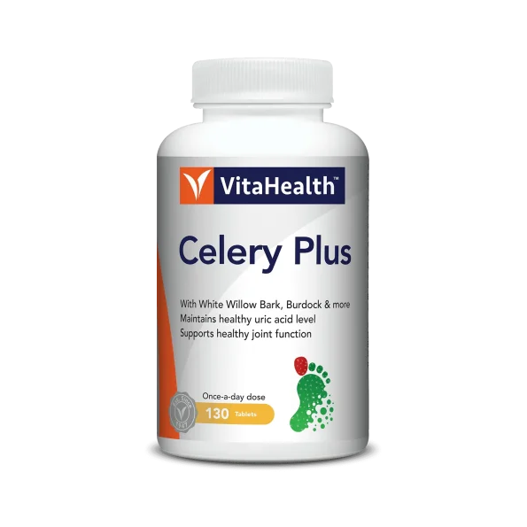 VitaHealth Celery Plus is specially formulated with a blend of 5 herbs to support healthy joint function by minimising the build-up of uric acid around the joint.