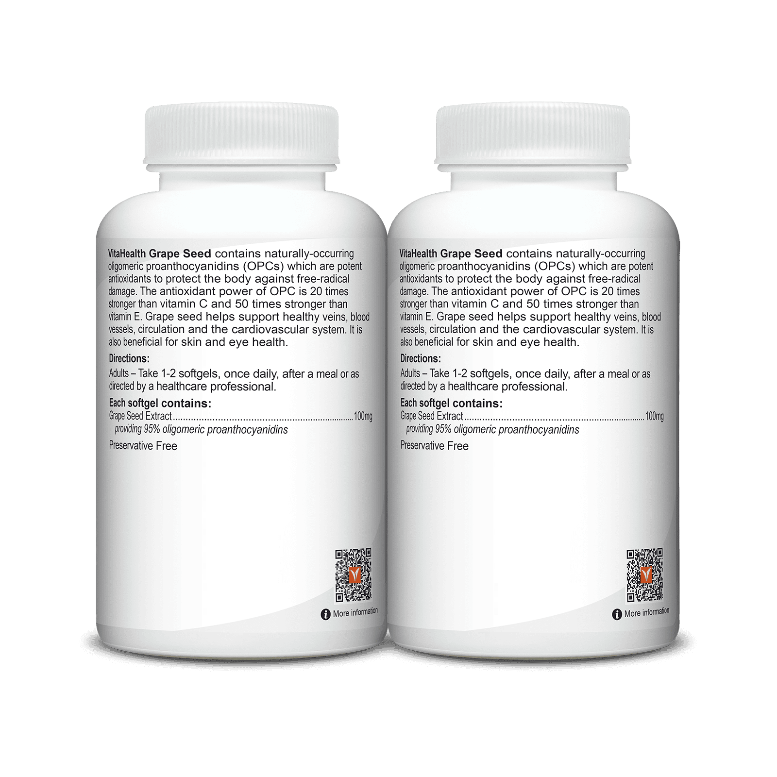 VitaHealth Grape Seed is formulated with 100mg grape seed extract, providing 95% oligomeric proanthocyanidins (OPCs) to protect the body from oxidative stress.