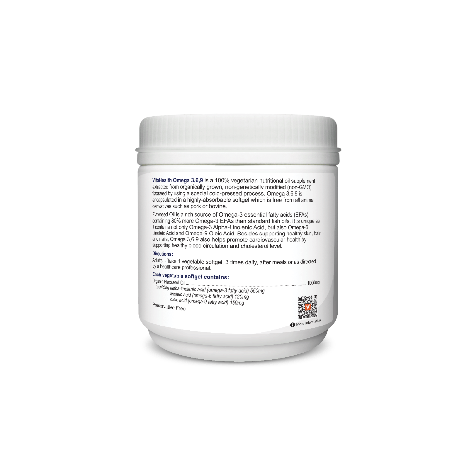 VitaHealth Omega 3,6,9 is extracted from organically grown, non-GMO flaxseed or linseed, encapsulated in vegetarian softgel.