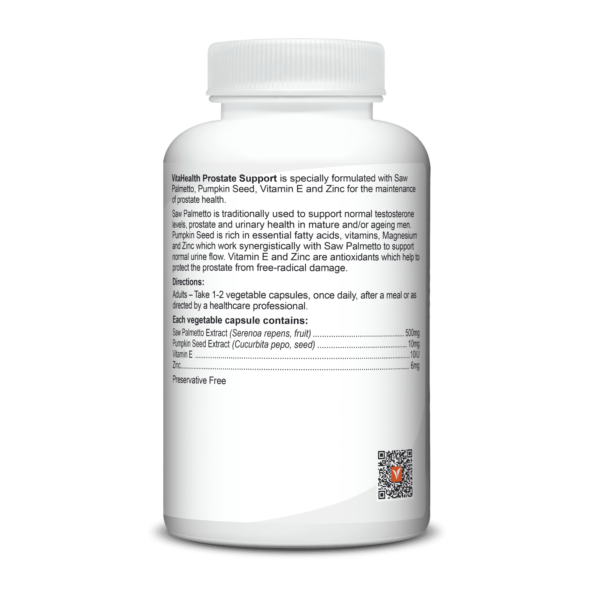 VitaHealth Prostate Support is a specially formulated with Saw Palmetto, Pumpkin Seed, Vitamin E and Zinc for the maintenance of prostate health.