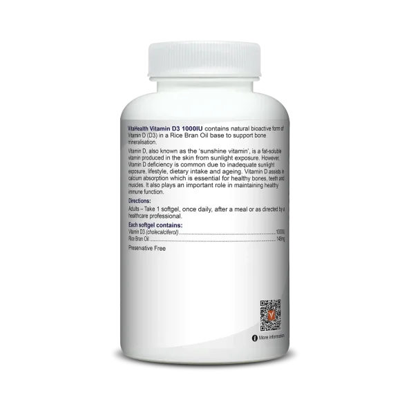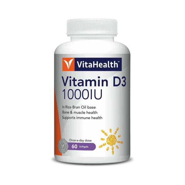 VitaHealth Vitamin D3 1000IU is formulated with high-strength vitamin D3 for the maintenance of bone and muscle health.