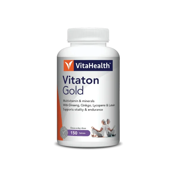 VitaHealth Vitaton Gold contains multivitamins, minerals, antioxidants with Ginseng, Gingko, Lutein and Lycopene to energise mind, body and eyes.