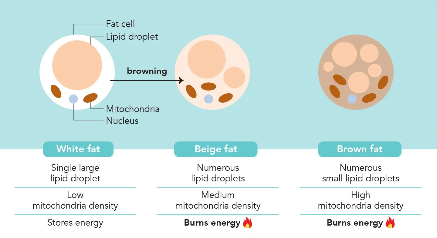 There are 3 types of fat cells in your body: white, brown and beige. White fat stores energy. In large quantity, it can lead to obesity. Conversely, brown fat burns energy into heat, to help speed up weight loss. Beige fat is derived from white fat in a process called ‘browning’. Once activated, it behaves like brown fat to burn energy and helps you lose weight faster.